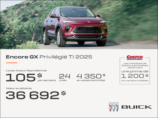 L'offre d'achat au comptant est basée sur le modèle 2025 BUICK Encore GX Privilégié TAV (4TR26 aad63e905c93), avec moteur 1,3L 3 cyl. et transmission CVT. Le prix de vente à l'achat au comptant est de 31 449,00 $ (plus taxes). Le prix de vente (31 449,00 $) à l'achat au comptant inclut les rabais: Comptant - Non Empilable (NSC) (2 000,00 $). Le prix de vente (31 449,00 $) à l'achat au comptant inclut: Transport et Préparation (2 300,00 $), Taxe d'accise sur le climatiseur (100,00 $) installation comprise. Plus (TPS/TVQ) et immatriculation. Le prix de vente (31 449,00 $) à l'achat au comptant exclus: Taxe sur les pneus (22,50 $). L'offre de financement est basée sur le modèle 2025 BUICK Encore GX Privilégié TAV (4TR26 aad63e905c93), avec moteur 1,3L 3 cyl. et transmission CVT. Offre de financement d'une periode limitée sur approbation de crédit. Les taux et les exigences peuvent varier en fonction de la solvabilité. Les paiements et conditions peuvent différer pour une utilisation commerciale. Certains client ne pourront se qualifier. Les taxes applicables sont calculées sur le montant total avant déduction de l'acompte. Le prix de vente en financement est de 33 449,00 $ (taxes en sus). Les paiements en financement incluent: Transport et Préparation (2 300,00 $), RDPRM (114,28 $), Taxe d'accise sur le climatiseur (100,00 $) installation comprise. Les paiements en financement excluent: Taxe sur les pneus (22,50 $). L'offre de financement est basée sur un terme de 84 mois avec un taux d'intérêt de 3,99%. Les 364 paiements à la semaine de 105,67 $ (121,49 $ taxes incluses) incluent un acompte de 0,00 $ et un échange net de 0,00 $. Les acomptes sont dus à la livraison du véhicule. Les crédits de taxes pour l'échange sont soumis à une preuve de propriété. L’obligation totale en financement est de 44 222,36 $ (taxes comprises). Les frais de crédit totaux en financement sont de 7 650,09 $. Le taux annuel en pourcentage (TAP) est de 5,69%. L'offre de location est basée sur le modèle 2025 BUICK Encore GX Privilégié TAV (4TR26 aad63e905c93), avec moteur 1,3L 3 cyl. et transmission CVT. Offre de location d'une periode limitée sur approbation de crédit. Les taux et les exigences peuvent varier en fonction de la solvabilité. Les paiements et conditions peuvent différer pour une utilisation commerciale. Certains client ne pourront se qualifier. Les taxes sur le comptant initial et les rabais après taxes (incluant les rabais du gouvernement) sont exclues et doivent être payées à la livraison. Le prix de vente en location est de 33 449,00 $ (taxes en sus). Les paiements en location incluent: Transport et Préparation (2 300,00 $), Taxe d'accise sur le climatiseur (100,00 $) installation comprise. Les paiements en location excluent: RDPRM (51,21 $), Taxe sur les pneus (22,50 $). L'offre de location est basée sur un terme de 48 mois avec un taux d'intérêt de 2,9%. Les 208 paiements à la semaine de 106,59 $ (122,55 $ taxes incluses) incluent un acompte de 0,00 $ et un échange net de 0,00 $. Les acomptes sont dus à la livraison du véhicule. L'acompte de 0,00 $ et la taxe sur l'acompte, l'échange net de 0,00 $ et le premier paiement de 122,55 $ sont dûs au début du bail. Le montant total dû au début du bail est 199,63 $ (Acompte de 0,00 $, Premier paiement (122,55 $), RDPRM (51,21 $), Taxe sur les pneus (22,50 $) et (TPS/TVQ) 3,37 $). Les crédits de taxes pour l'échange sont soumis à une preuve de propriété. L'offre de location est basé sur un plan de kilométrage de 20000 km par année. Des frais de 0,16 $ par kilomètre supplémentaire seront applicables. La valeur résiduelle estimée est de 14 048,58 $. Une option d'achat à la fin de la location pourrait être disponible (Valeur de Rachat) au montant de 14 048,58 $. Un dépôt de sécurité pourrait être requis. L’obligation totale en location est de 25 567,48 $ (taxes comprises). Les frais de crédit totaux en location sont de 4 770,30 $. Le taux annuel en pourcentage (TAP) est de 5,25%. Immatriculation, assurance, enregistrement, options additionnelles et taxes applicables sont en sus. Le véhicule illustré est basé sur le modèle 2025 BUICK Encore GX Privilégié TI (4TV26 1SB), avec moteur 1,3L 3 cyl. et transmission Automatique 9 vitesses. Le prix de vente à l'achat au comptant du véhicule illustré est de 33 449,00 $. Les détails de prix sont à titre informatif seulement et ne sont pas destinés à être une offre d'achat. Les montants indiqués n'incluent pas les frais d'immatriculation, l'enregistrement, l'assurance et certains autres frais (par exemple, les produits ou services facultatifs mis à votre disposition).
